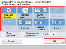Appuyer sur [Réglages de fonction] → [Copie] → [Enregistrer raccourcis Options].