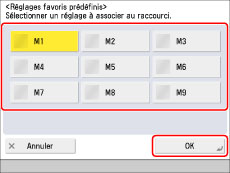 Appuyer sur [Réglages fav. prédéfinis] → sélectionner les réglages favoris attribués → appuyer sur [OK].