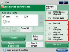 Il est possible de mémoriser des réglages dans les touches de raccourcis affichées à l'écran Fax. Jusqu'à quatre touches souhaitées peuvent ainsi être mémorisées dans [Options].