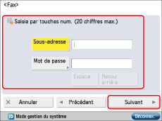 Appuyer sur [Sous-adresse] → saisir le mot de passe du destinataire à l'aide des touches numériques