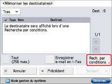 Si [Rech. auto si utilisation serveur LDAP] est réglé sur "Non", l'écran présentant la liste des destinataires reste vide jusqu'à ce qu'une recherche soit effectuée.