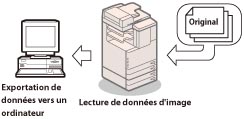 La fonction de lecture en réseau permet d'utiliser l'imageRUNNER ADVANCE C2220L comme scanner conventionnel. Il est possible de lire un document à l'aide de la machine et de lire les données dans une application de l'ordinateur. Il est possible de lire des images jusqu'au format A3 à une résolution de 600 x 600 ppp.