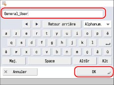 Si l'on utilise le système d'authentification utilisateur Local Device Authentication de SSO-H (notamment la combinaison "Active Directory Authentication + Local Device Authentication"), le nom d'utilisateur et le mot de passe ne peuvent compter que les caractères suivants (en respectant la casse) :