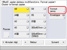 Le format papier spécifié doit être identique à celui du papier chargé dans le plateau multifonctions. Si l'on sélectionne un format de papier ou d'enveloppe différent, un bourrage papier risque de se produire.