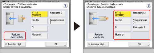 Le format d'enveloppe spécifié doit être identique à celui des enveloppes chargées dans le plateau multifonctions. Si l'on sélectionne un format de papier ou d'enveloppe différent, un bourrage papier risque de se produire.