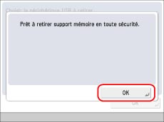 Le message et la touche de retrait s'affichent si [Utiliser pilote MEAP pour périph. entrée USB] est réglé sur "Non". (Voir "Utilisation du pilote MEAP pour le stockage externe sur un périphérique USB".)