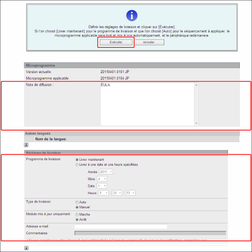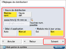 [Livrer maintenant] : Télécharge le microprogramme une fois le réglage de distribution spécifié.