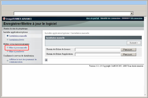 A partir du portail de l'interface utilisateur distante, cliquer sur [Réglages/Enregistrement] → [Licence/Autre] → [Enregistrer/Mettre à jour logiciel].