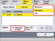Pour imprimer l'historique des opérations de réception correspondant au Rapport de télécopie, sélectionner [Fax] dans la liste déroulante. (Voir "RAPPORT D'ACTIVITES FAX - TX/RX".)