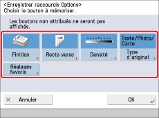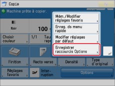 Il est possible de créer des raccourcis vers les fonctions les plus fréquemment utilisées sous [Options]. Les [Réglages favoris] peuvent être mémorisés dans des touches de raccourci. Pour plus d'informations sur les réglages favoris, voir