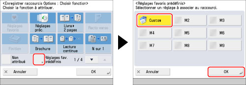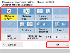 Appuyer sur [Réglages fav. prédéfinis] → sélectionner des réglages favoris attribués → appuyer sur [OK].