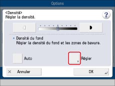 Si la densité de fond est réglée en appuyant sur [Régler] pour <Densité du fond>, le réglage [Auto] est annulé. De même, si on appuie sur [Auto] en réglant la densité manuellement sous [Régler], les réglages sont annulés. La machine règle automatiquement la densité en fonction du fond.