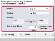 Si l'option [Option numérot.] est réglée sur "Oui", la taille des numéros de jeux de copies peut être réglée sur [10,5 pt], [12,0 pt] ou [14,0 pt]. (Voir "Options de numérotation des jeux de copies".)