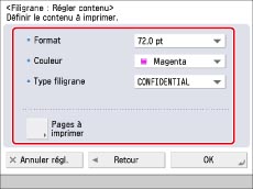 Il est également possible de sélectionner le texte mémorisé dans [Enreg. caractères pour Num. pgs/Filigrane].(Voir "Mémorisation/modification/suppression de texte personnalisé pour la numérotation des pages et les filigranes".)