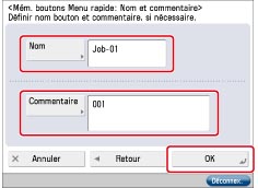 Si [Oui] est sélectionné, les opérations enregistrées dans le bouton démarrent sans aucune confirmation des réglages lorsque l'utilisateur appuie sur ce bouton. Il n'est pas nécessaire d'appuyer sur pour lancer la tâche.
