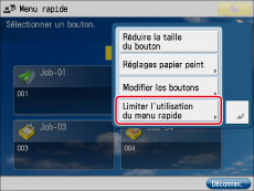Seul l'administrateur système, l'administrateur système SSO-H (Administrator), l'administrateur réseau Network Administrator (NetworkAdmin) ou l'administrateur de périphériques (DeviceAdmin) est autorisé à modifier la configuration des réglages de restriction d'accès au menu rapide. Pour plus d'informations sur les types d'administrateur, voir "Réglages administrateur".