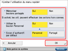 si <Mémoriser boutons partagés> est réglé sur [Oui], les utilisateurs généraux et les utilisateurs non autorisés peuvent mémoriser, modifier ou supprimer un bouton commun, ou modifier la taille des boutons ou l'image du papier peint.