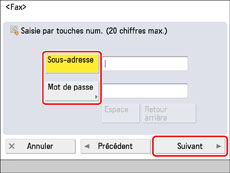 Saisir [Sous-adresse] et [Mot de passe] → appuyer sur [Suivant].