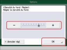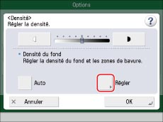 Si la densité de fond est réglée en appuyant sur [Régler] sous <Densité du fond>, le réglage [Auto] est annulé. De même, si l'on appuie sur [Auto] pendant le réglage manuel de la densité sous [Régler], les réglages sont annulés. La machine règle automatiquement la densité en fonction du fond.