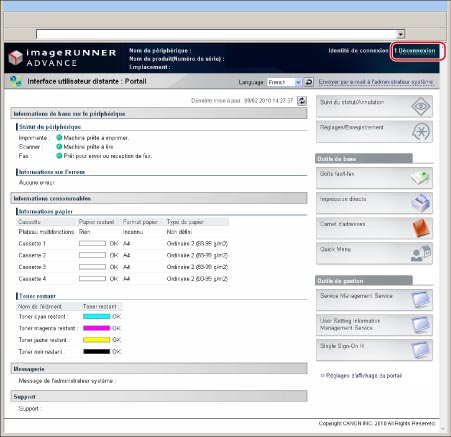 Cette section décrit les procédures, en supposant que la machine est configurée avec les réglages par défaut. Si la gestion des numéros de service ou l'authentification pour SSO-H sont définies, entrer les informations nécessaires à chaque connexion.