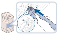 Soutenir la nouvelle cartouche de toner avec une main dessous tout en l'insérant dans la machine avec l'autre main.