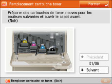 Pour obtenir des instructions détaillées relatives au remplacement de la cartouche de toner, appuyer sur [Précédent] ou [Suivant] sur l'afficheur tactile.