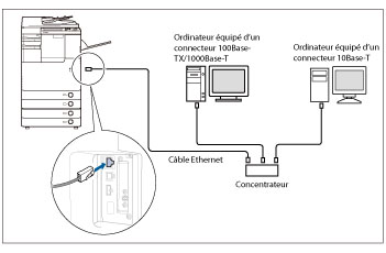 En cas d'environnement mixte 10Base-T/100Base-TX/1000Base-T, les périphériques du réseau (concentrateurs, routeurs, etc.) doivent prendre en charge cet environnement. Pour plus d'informations, contacter le revendeur local agréé Canon.