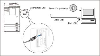 Si l'on souhaite connecter la machine à un ordinateur via un câble USB, vérifier que l'option [Utiliser comme périphérique USB] (sur l'écran Réglages USB) est réglée sur "Oui". (Voir "Utilisation du port USB".)
