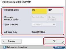 La machine détermine automatiquement le type Ethernet. Appuyer sur [Oui], sauf pour spécifier un réglage Ethernet particulier.