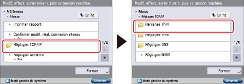 Si la machine est redémarrée après configuration des réglages DHCP, BOOTP ou RARP, l'écran Réglages TCP/IP affiche les valeurs d'adresse IP obtenues depuis le serveur DHCP, BOOTP ou RARP. (Si l'adresse IP, le nom d'hôte et le nom de domaine ont déjà été définis, ils seront remplacés par ceux spécifiés à l'aide de DHCP, de BOOTP ou de RARP.)