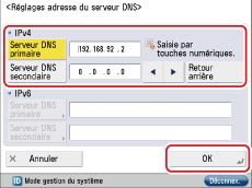 Si [BOOTP] ou [DHCP] est réglé sur "Oui" à l'étape 5, l'adresse IP d'un serveur DNS défini manuellement sera remplacée.