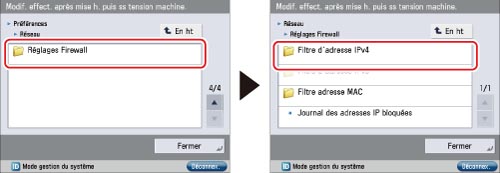 Si une tentative d'envoi ou de réception des données entre la machine et le périphérique dont l'adresse IPv4 ou le numéro de port doit être refusée, un journal d'éléments bloqués est créé. Pour afficher ce journal, voir "Vérification du journal d'éléments bloqués".