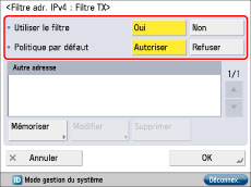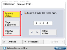 Il est possible de mémoriser jusqu'à 16 adresses IPv4, plages d'adresses IPv4 ou préfixes d'adresse IPv4.