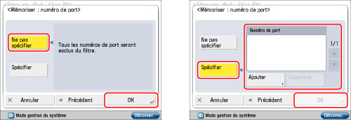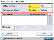 Si l'utilisation d'un protocole ou d'une application d'impression n'est pas autorisée sur le périphérique, celui-ci ne peut pas être employé, même si les réglages de [Réglages Firewall] ont été modifiés. Il est donc nécessaire de configurer les réglages pour autoriser le protocole ou l'application d'impression.
