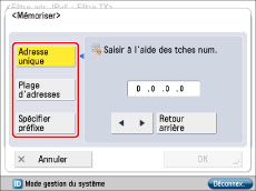 Si ces informations ne peuvent pas être obtenues via DHCP, RARP ou BOOTP après avoir redémarré la machine, entrer l'[Adresse IP], le [Masque de sous-réseau] et l'[Adresse de passerelle] pour utiliser les réglages saisis à cette étape.