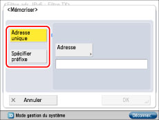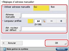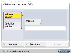 Si [Adresse manuelle] demeure vide, il est impossible d'utiliser une adresse manuelle. De plus, aucune des adresses suivantes ne peut être définie pour [Adresse manuelle] :