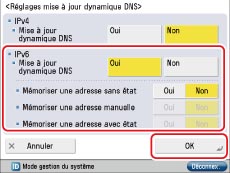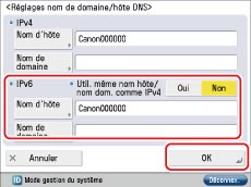 Si l'option <Utiliser DHCPv6> a été définie sur "Oui" à l'étape 7, le nom de domaine spécifié manuellement sera écrasé. Même si <Util. même nom hôte/nom dom. comme IPv4> est réglé sur "Oui", le nom de domaine obtenu du serveur DHCPv6 est utilisé.