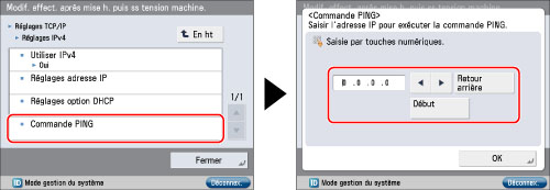 Appuyer sur [Commande PING] pour [Réglages IPv4] → saisir une adresse IPv4 qui existe sur le réseau → appuyer sur [Début].