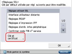 Appuyer sur [Réglages SSL] pour [Réglages TCP/IP] → [Clé et certificat].