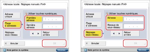 Pour spécifier une plage d'adresses IPv4 : Appuyer sur [Plage d'adresses] → appuyer sur [Première adresse] → saisir la première adresse IPv4 → appuyer sur [Dernière adresse] → définir la dernière adresse IPv4.