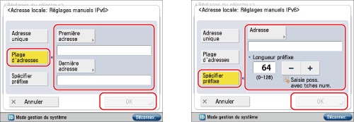 Pour spécifier le préfixe d'adresse IPv6 : Appuyer sur [Spécifier préfixe] → [Adresse] → saisir le préfixe d'adresse IPv6 → appuyer sur [OK]. Saisir la longueur du préfixe de l'adresse IPv6 dans [Longueur préfixe].
