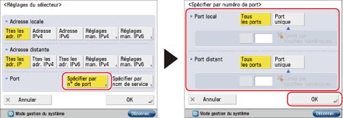 Appuyer sur [Spécifier par n° de port] pour <Port> → spécifier <Port local> et <Port distant> → appuyer sur [OK].