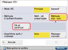 Appuyer sur [Méthode sign. num.] pour <Méthode d'authentification> → [Clé et certificat].