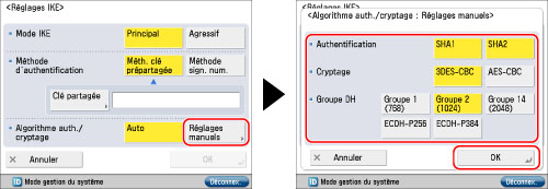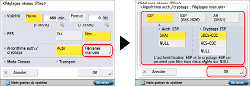 Sélectionner [Réglages manuels] pour <Algorithme auth./cryptage> → définir l'algorithme d'authentification et de cryptage à appliquer à la SA IKE → appuyer sur [OK].