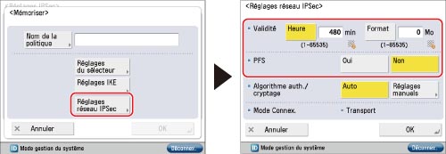 Appuyer sur [Réglages IPSec] pour [Réglages TCP/IP] → [Oui] pour <Utiliser IPSec>.
