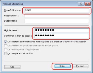 Dans la boîte de dialogue [Nouvel utilisateur], saisir le nom d'utilisateur dans [Nom d'utilisateur] → saisir le mot de passe dans [Mot de passe] → saisir à nouveau le mot de passe dans [Confirmer le mot de passe] → cliquer sur [Créer].