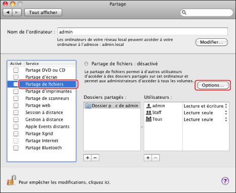 Sélectionner [Partage de fichiers] → cliquer sur [Options].