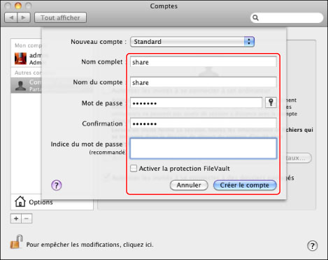Dans la fenêtre [Comptes], saisir le nom de l'utilisateur auquel les données doivent être envoyées depuis la machine via Mac OS X → saisir le mot de passe.