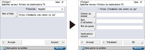 Il est possible d'utiliser 128 caractères alphanumériques pour [Nom d'hôte] sur le panneau de commande. Il est possible d'utiliser 255 caractères alphanumériques pour [Chemin du dossier]. Définir les réglages du serveur en fonction du nombre maximal de caractères.