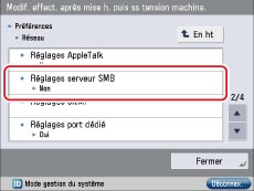 Appuyer sur [Préférences] → [Réseau] → [Réglages serveur SMB].
